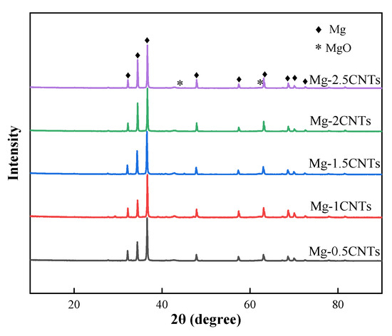 Figure 4 shows the X-ray diffraction patterns of CNT/Mg composites with different CNT contents. As can be seen, the composites are mainly composed of magnesium. In addition, the relatively low peak value of MgO proves the presence of a small amount of MgO in the composites. This may be caused by the contact and reaction between the Mg and O2 during powder preparation. Due to the small content of CNTs, no peaks of C and Ni phases can be found in the composites. Similar results also appeared in other literature reports [8].