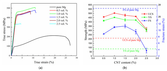 Figure 7 shows the true stress–strain curves and properties of CNT/Mg composites with different CNT contents under compression. Compared with pure Mg, the yield strength and ultimate compressive strength of the composites are greatly increased, while the fracture strain is decreased. When the CNT content is 1.0%, the yield strength and ultimate compressive strength of the composite are increased by 140% and 426% compared with pure Mg. The standard deviation of these data (Figure 7b) is very small, which means that the statistical variability is low.