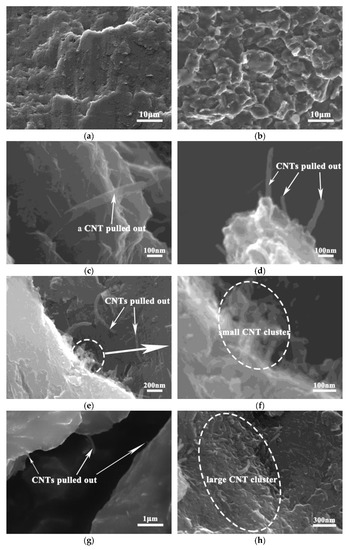 SEM images of the fracture morphologies in CNT/Mg composites with different contents of CNTs: (a) pure Mg; (b) CNT/Mg composites; (c) 0.5 vol.%; (d) 1 vol.%; (e,f) 1.5 vol.%; (g,h) 2.5 vol.%.