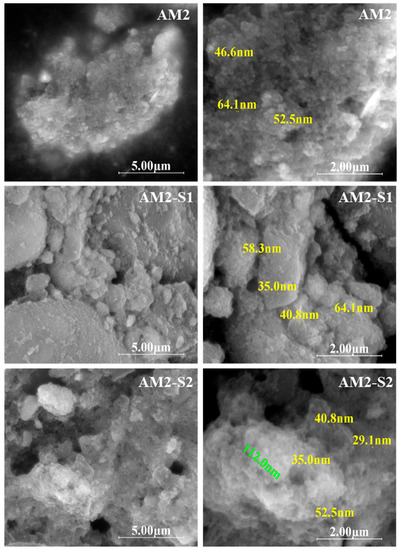 The biggest nanoparticle size indicates the agglomeration of the silver-decorated AM2 core, in contrast with the corresponding silver-free M2 sample (24 nm) [4]. Strings of self-assembled superparamagnetic nanoparticles with an approximate length of 700–900 nm can be observed for sample AM1-S1 (Figure 1-dimensions in green). Additionally, a complex porous morphology is depicted for all the Ag-decorated samples, especially the core–shell IOMNPs (Figure 1). Based on the radial dimension, three classes of pores are considered by IUPAC, namely micropores (r ≤ 2 nm), mesopores (2 nm < r < 50 nm), and macropores (r > 50 nm) [52].