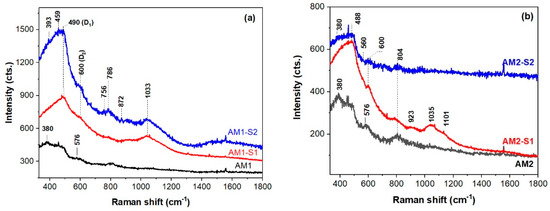 UV–Raman spectra of the (a) AM1(-/S1/S2) and (b) AM2(-/S1/S2) samples.