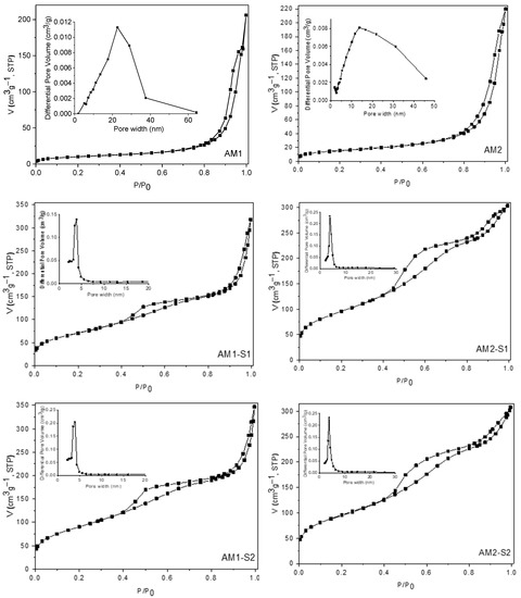 The N2 physisorption measurements were carried out to investigate the textural features of the samples under discussion. Thus, the nitrogen adsorption–desorption isotherms and the corresponding pore-size distribution (PSD) curves of the samples are shown in Figure 4. All the isotherms are of type IV, according to the IUPAC classification [63,64]. The values of BET surface areas and the total pore volumes are listed in Table 1. The AM1 and AM2 samples display the isotherms typical for materials with large mesopores having steep condensation under a very high relative pressure (p/p0 > 0.8). This type of porosity is given mainly by the interparticle voids. For the samples containing silica, the capillary condensation phenomena appear at relative pressures higher than 0.4, giving rise to hysteresis loops of H3 type, which could be an indication for the presence of slit-shape pores [65,66]. The PSD graphs confirm the presence of small and uniformly distributed mesopores ranging from 3 to ~6 nm, with slightly smaller values for the AM2-S1 and AM2-S2 samples.