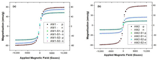 The magnetization hysteresis curves in Figure 5 and almost no remanence and coercivity (Table 1) for the Ag-decorated iron oxide samples (AM1 and AM2), together with the corresponding Ag-decorated core-hybrid shell of SiO2/ZnO modified (M1-S1/2 and M2-S1/2) IOMNPs indicate that all samples are superparamagnetic. As expected, higher saturation magnetization, Ms, calculated with the Langevin function was recorded for the higher temperature (95 °C) obtained AM1 (see Table 1). In addition, the Ms value of 83.23 emu/g for the AM1 is bigger than the one for the Ag-free sample M1 (70.12 emu/g) [4], being closer to the 90 emu/g the bulk Fe3O4 [67]. The same trend was observed for the Ms values of the AM1 set (AM1-(-/S1/S2), in contrast with the Ag-free M1 set of samples [4]. This finding is in line with the findings for the Ag/Fe3O4 NPs, where a smaller crystal domain size was observed as dopant content increased or there was richer Fe2+ content in the cubic inverse spinel structure of the Fe3O4 cores [68].