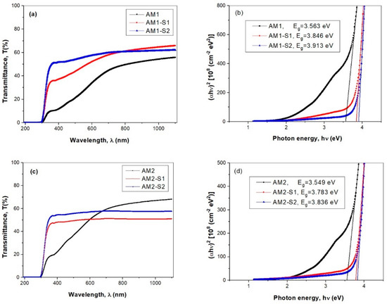 Since the optical band gap energy (Eg) helps predict the photochemical properties of semiconductors [45,71], the optical transmittance spectra and calculated Eg values of the silver-decorated iron oxide, and the corresponding core–shell silica-modified thin films are illustrated in Figure 6. The Eg values have been determined by extrapolating the linear parts to zero absorption with the photon energy axis. The intercepts of these extrapolations, taken as the value of the optical band gap energy, Eg, are presented in Figure 6b,d. A significant blue-shift was observed for the Ag-decorated core–shell NPs up to 600–700 nm spectral range the optical transmission percentage decreases in succession: AM(1/2)-S2 > AM(1/2)-S1 > AM(1/2) (Figure 6a,c), with increasing silver content. The Ag films were reported to have high absorption over the short wavelength domain and, hence, lower optical transmittance [72]. The optical spectra in Figure 6a show improved transmittance of the core–shell-containing films in the AM1 set, in comparison with corresponding the AM1 core. Conversely, the highest percentage of transmission is recorded for the AM2 core film (68%), within the 684–1200 nm (NIR) range (Figure 6c).