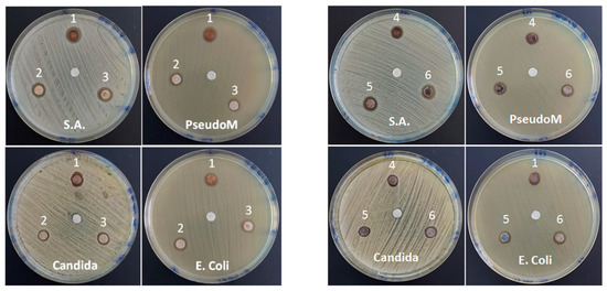 Disk diffusion assay for the investigated samples: AM1(1), AM1-S1(2), AM1-S2(3), AM2 (4), AM2-S1(5), and AM2-S2(6).