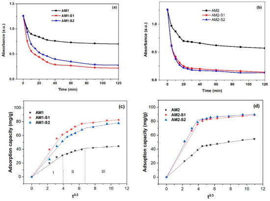 Dark adsorption (a,b) and adsorption capacity of MB on AM(1/2)-S(1/2) NPs vs. (c,d) (c(MB) = 5 mg/L, V = 25 mL of MB solution and w(AM(1/2)-S(1/2) = 0.040 g at room temperature).