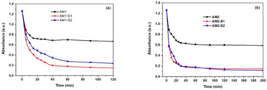 Quick adsorption of the MB (<30 min.) on the Ag-decorated ternary core–shell samples (Figure 8 and Figure S4) was followed by a slower adsorption rate up to equilibrium (120 min). It is very likely that, in the second, slower stage, fewer active sites were available on the surface, so MB was adsorbed on the internal surface (pores). After two hours, the percentage of adsorption capacity (qt) in Figure 8c,d varied with the SBET values in Table 1. Thus, the biggest adsorption capacity/efficiency (~90 mg/g) and SBET value of 344.6 m2/g were recorded for the AM2-S1 NPs, and vice versa, the lowest η of ~44 mg/g corresponded to the lowest SBET of 36 m2/g in case of the AM1 NPs. Analogous with the corresponding Ag-free NPs [4], the Ag-decorated NPS with single SiO2 and hybrid SiO2/ZnO shells had the biggest absorption efficiency and an early steeper sorption process, in comparison with the core AM1 and AM2 NPs. Optimization of the MB sorption process requires additional kinetic information on the mechanism of the sorbent–sorbate interaction [77].