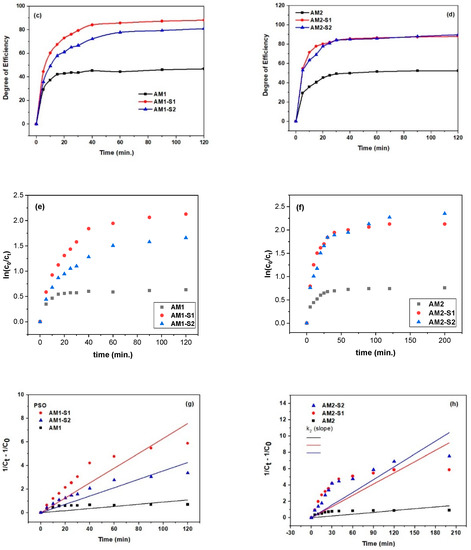 Photocatalytic degradation of MB on Ag-decorated AM1, AM2, and AM(1/2)-S(1/2) nanocatalysts via UV–Vis spectrophotometry (a,b), MB discoloration efficiency (c,d), photodegradation kinetics: PFO (e,f) and PSO (g,h) (c(MB) = 5 mg/L, V = 25 mL of MB solution and w(AM(1/2)-S(1/2) = 0.040 g at room temperature).