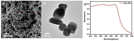 (a) SEM image of WS2 NPs, (b) TEM image of WS2 NPs. (c) absorption spectrum of WS2 NPs.