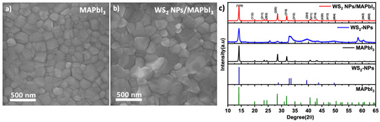 (a) SEM image of MAPbI3, (b) SEM image of WS2 NPs/MAPbI3, and (c) XRD patters of the MAPbI3, WS2 NPs, and WS2 NPs/MAPbI3.