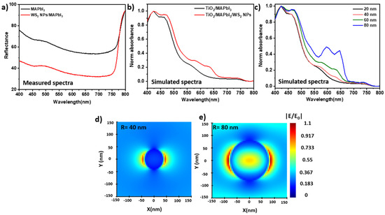 (a) Reflectance spectrum of MAPbI3 and WS2 NPs/MAPbI3, (b) simulated absorption spectrum of MAPbI3/WS2 NPs and MAPbI3/WS2 NPs/TiO2, (c) simulated absorption spectrum of WS2 NPs with different radius, (d,e) simulated electric field distribution at 710 nm of WS2 NPs with radius of (d) 40 nm (e) 80 nm.