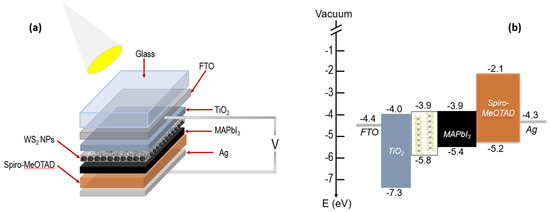 (a) configuration of WS2 NPs/MAPbI3 heterostructure-based PSCs, and (b) schematic energy level diagram.