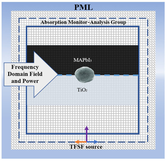 The embedded WS2 NP at the interface of TiO2 and MAPbI3 is modeled as a sphere inside a dielectric material. The model, without the WS2 NP, is considered the reference model and the signal is considered as the reference signal. We examine the size effect of the WS2 nanoparticle (10–80 nm). The background index of the FDTD region was set to be n = 1 for air. The dielectric functions of MAPbI3, TiO2, and WS2 are extracted from [43,44,45] In this simulation system, the mesh order of the NP was set to 2, and the TiO2 and MAPbI3 mesh orders were 3 [46].