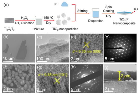 Preparation of TiO2/PI nanocomposites. (a) Process schematics for the preparation of TiO2/PI nanocomposites. (b) SEM image, (c) low-magnification TEM image, (d) high-magnification TEM image, and (e) SAED pattern of Ti3C2Tx. (f) SEM image, (g) high-magnification TEM image, and (h) SAED pattern of TiO2 nanoparticles. (i) Cross-sectional SEM image of TiO2/PI nanocomposite.