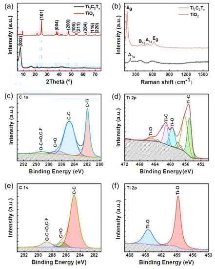 Characterization of Ti3C2Tx nanosheets and TiO2 nanoparticles. (a) XRD and (b) Raman spectra of Ti3C2Tx nanosheets and TiO2 nanoparticles. XPS spectra of (c) C 1s and (d) Ti 2p components of Ti3C2Tx nanosheets. XPS spectra of (e) C 1s and (f) Ti 2p components of TiO2 nanoparticles.