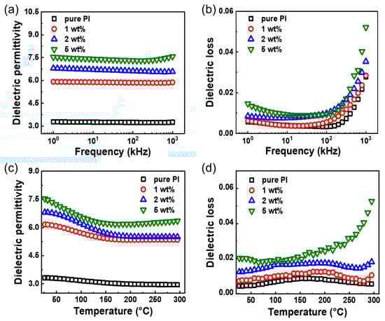 Dielectric properties of TiO2/PI nanocomposite. Frequency-dependent (a) dielectric permittivity and (b) dielectric loss of pure PI and TiO2/PI nanocomposites with various loading contents of 1, 2, and 5 wt% at RT. Temperature-dependent (c) dielectric permittivity and (d) dielectric loss of pure PI and TiO2/PI nanocomposites with various loading contents of 1, 2, and 5 wt% at 1 kHz.