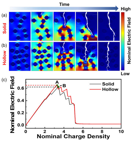 Finite element analysis of energy storage performance of TiO2/PI nanocomposites. Finite element simulation of breakdown evolution of TiO2/PI nanocomposites with (a) solid and (b) hollow nanoparticles. (c) Relationship between nominal electric field and charge density for PI-based nanocomposites with solid (grey curve) and hollow (red curve) nanoparticles.