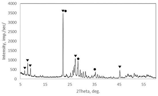 The crystallinity and phase composition of the catalyst was determined by X-ray diffraction (2θ range of 5° to 60°). XRD analysis of the catalyst was obtained (Figure 1), and post-catalytic tests are identical and indicate the presence of a well-crystallized mixture of M1 and M2 phases in accordance with the literature data [27]. It is known from the literature that the active and selective catalysts of the MoVTeNb composition are a mixture of two crystalline phases (M1 + M2) and may also contain a small number of amorphous impurities [17].