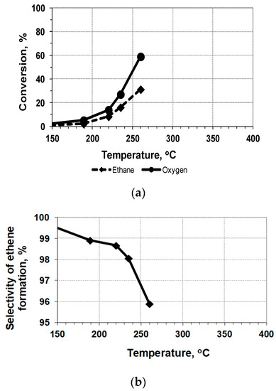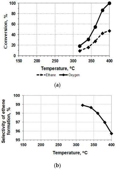 As to the gas flow, the catalyst was tested at an atmospheric pressure in the gas mixture [75% C2H6 + 25% O2] at the gas flow rate of 2200–2500 h−1. For this gas mixture, the conversion of ethane theoretically can reach ~66% (at 100% selectivity and complete O2 consumption). In our tests, the ethane conversion was kept at a level <40% to avoid the complete removal of the oxidant from the gas phase.