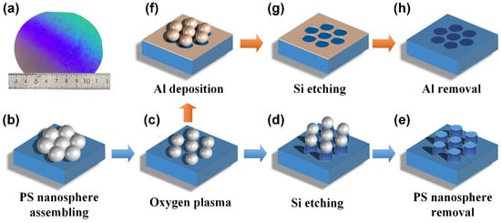 Figure 1 shows the schematic diagram of nanopillars and nanoholes experimental flow based on the air–liquid interface self-assembly method. The sample of PS nanospheres template mask on Si substrate as shown in Figure 1a. The PS nanospherical latex solution with a diameter of 500 nm (5.0 wt% dispersed in water with a particle size difference coefficient of about 3%) was purchased from Zhongke Leiming (Beijing, China) Technology Co., LTD. In the beginning, the PS nanospheres dispersed in water/ethanol were slowly driven into the water/air interface through a needle tube and sodium dodecyl sulfate was then added to form a tightly packed monolayer. Then the deionized water was drawn out slowly by a pipette needle until the monolayer was fully contact with the hydrophilic silicon wafer. The successfully assembled PS nanospheres on Si substrate is shown in Figure 1b, and the next step is separated into two different flows: one is for nanopillars and the other is for nanoholes. Firstly, oxygen plasma was used to etch the PS nanospheres for 20 s in order that the size of PS nanospheres met the needs of the experiment for the nanopillars structure, as shown in the Figure 1c. Then, the PS nanospheres can be used as a mask to etch Si materials by the RIE machine with CF4 gas with a flow velocity of 65 sccm and a power of 80 W. The nanopillars structures came into being with it, as shown in Figure 1d. Lastly, the oxygen plasma etching technique was used to remove the PS nanospheres on nanopillars (lasting about 2 min). The final nanopillars structures is as shown in Figure 1e. Unlike the 20 s for nanopillars structure, oxygen plasma was used to etch the PS nanospheres for 30 s for the nanoholes structure. Because the PS nanospheres is also etched in the process of Si etching in the Figure 1d. The PS nanospheres should avoid etching too long in the first place for nanopillars in case the PS nanospheres was excessively etched in the end. Then, an Al film with a 50 nm thick formed on the nanoholes structures sample via an evaporation process. This step was using magnetron sputtering with magnetron chamber working below 3 × 10−6 Pa, as shown in the Figure 1f. Next, the PS nanospheres soaked in acetone solution that were removed by ultrasound for 3 min. The resulting patterned metal structure can be used as an etching mask for the nanoholes etching, as shown in the Figure 1g. The etching process of Si nanoholes used the same etching parameters as nanopillars by the RIE machine (a CF4 gas with a flow velocity of 65 sccm and a power of 80 W). Finally, to remove the Al film, the sample of self-assembled nanoholes was soaked overnight in dilute hydrochloric, as shown in the Figure 1h.