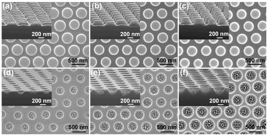 The SEM images for (a) top view of nanopillar 1 on Si substrate, (b) top view of nanopillar 2 on Si substrate, (c) top view of nanopillar 3 on Si substrate, (d) top view of nanohole 1 on Si substrate, (e) top view of nanohole 2 on Si substrate, (f) top view of nanohole 3 on Si substrate (The side view SEM images of each nanostructure as shown in its own inset).