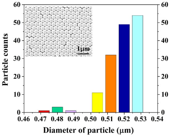 The size distribution of PS nanospheres (The inset is the SEM image of PS nanospheres).