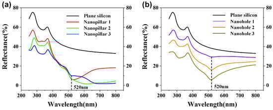 Reflection curves of (a) plane silicon and three different sizes for nanopillars samples; (b) plane silicon and three different sizes for nanoholes samples.