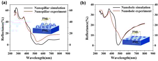The reflection properties as a function with the operation wavelength in the simulations and experiments for the self-assembled nanopillars structures (a), and nanoholes structures (b). The inset is the calculation model of nanopillars and nanoholes structures in the 3D FDTD simulation.