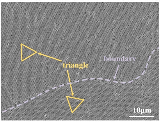 SEM image of the PS nanosphere surface. The red dashed line is the boundary of PS nanospheres region, and the triangle illuminates the arrangement of adjacent nanospheres.