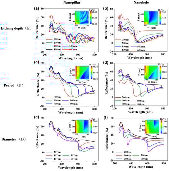 In this section, we will focus on discussing the tunable antireflection properties of the self-assembled nanopillars and nanoholes structures with the change in structures parameters using the 3D FDTD method. Figure 7a,b show the reflectance properties of the self-assembled nanopillars and nanoholes structures as a function of the different etching depth (height for nanopillars, depth for nanoholes) of the nanostructure. For the nanopillars structures, it can be clearly seen that the reflectivity decreases with the height of nanopillars in the short-wavelength range. At addition, a sharp dip and oscillation occur at the operation wavelength of 450 nm, which may be caused by the reflected light interference from the Si substrate [21]. For the nanoholes structures, it shows the similar trend of reflectance variation with the nanopillars structures in the short-wavelength range. A sharp dip occurs at the operation wavelength of 450 nm, which is becoming wider with the increased depth the nanoholes structures. Therefore, the reflection of the self-assembled nanopillars and nanoholes structures can reduce with the increase in height and depth. The antireflection properties of the self-assembled nanopillars structure as a function of the nanostructure period, as shown in Figure 7c,d. One can see that the reflectance of the nanopillars and nanoholes structures are increasing with the increase in the nanostructure period in the operation wavelength of 250–800 nm. Due to the diffraction effect, the reflectance dips show a red-shift and gradually increase with the increase in the nanostructure period. As a result, the diffraction intensity of the self-assembled nanostructures is suppressed with the increase in the nanostructure period. Figure 7e,f show the reflectance properties of the self-assembled nanopillars and nanoholes structures with the change in the different diameter. The reflectance is decreasing with the increase in the diameter of nanopillars and nanoholes in the operation wavelength of 250–800 nm. However, the reflectivity increases slowly and levels off at the diameter greater than 700 nm. At addition, it be noticed that the position of reflectance dips depends on the diameter and period of the nanostructures, which can be demonstrated by the grating theory based on the diffraction effect of periodic nanostructures [38,39,40].