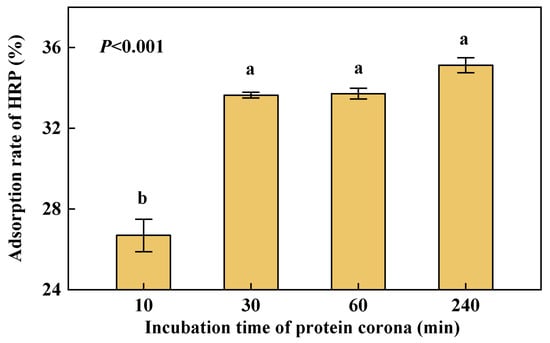 Adsorption rate changes of PS NPs to HRP over time. Dates are means ± SE (n = 3). Different letters indicate a significant difference at p < 0.05.