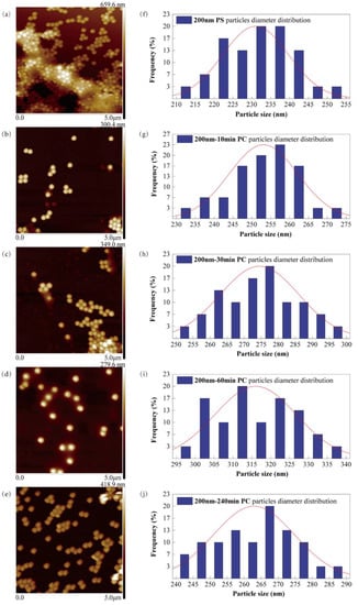 AFM images and diameter distribution of PS NPs (a,f) and PS-HRP PC incubated for 10 min (b,g), 30 min (c,h), 60 min (d,i), and 240 min (e,j).
