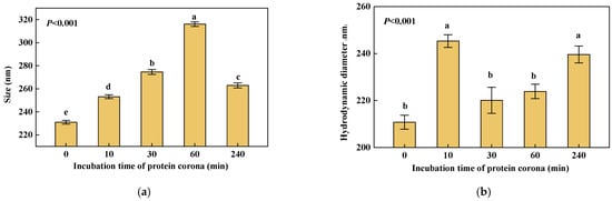 Size (a) and hydrodynamic diameter (b) changes of PS NPs and the PC over time. Dates are means ± SE (n = 3~30). Different letters indicate a significant difference at p < 0.05.
