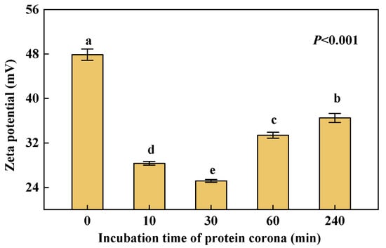 According to Figure 4, PS NPs are all positively charged in the aqueous solution regardless of whether or not they interact with HRP. The Zeta potential of the pristine NPs in the control group was 47.9 ± 1.0 mV, and the absolute value decreased significantly after contact with HRP. The formation of the PC reduced charges on NPs’ surface and decreased the stability of the dispersion system. In addition, Zeta potential showed a downward trend from 0 min to 30 min and an upward trend from 30 min to 240 min. At 30 min, Zeta potential reached a minimum value of 25.2 ± 0.3 mV, and the solution system was in the most unstable state. The stability of PS NPs was destroyed by HRP during the initial formation of the PC. Then, through the densification process of the PC, the stability of the system gradually recovered and stabilized again. Studies have shown that the colloid was stable at a point where enough proteins were present in the solution to cover all nanoparticles’ surfaces in a monolayer fashion [28]. The PC formation can enhance particle stability by forming a layer between the nanoparticles and thus the solvent interfering with interparticle interactions and reducing or inhibiting agglomeration [29].