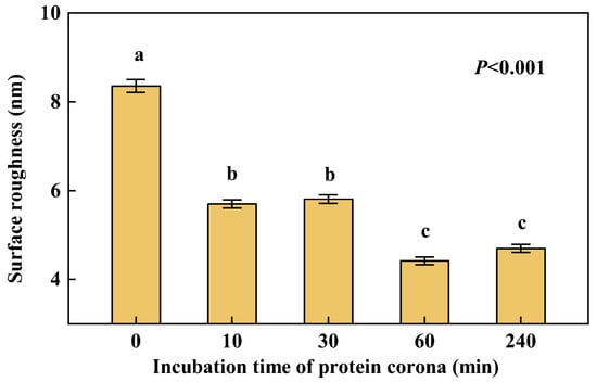 The results show that the surface roughness of PS NPs has reduced from 8.35 nm ± 0.15 nm to about 4 nm after the formation of the PC (Figure 5) and indicate that the formation of PS-HRP PC changed the surface of NPs from relatively rough to smooth. The functional amino (-NH2) group modified on the surface of NPs may increase the surface roughness. The surface of NPs was then wrapped by more and more HRP, as well as changes in HRP conformation and structure, leading to a decrease in surface roughness. In addition, the surface roughness of NPs showed a general downward trend over time. A noticeable decline in surface roughness was observed during 30 min~60 min. The above illustrated that the surface roughness changes significantly in the earlier and later stages of PS-HRP PC formation. It may be because the conformation and structure of the PC undergo qualitative changes in the later stage with more HRP attached to the NPs and the further interaction between them, such as the effect of the modified amino group.