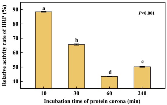 According to Figure 6, the interaction with PS NPs would lead to a decrease in HRP activity. From 0 min to 60 min, the relative activity of HRP gradually decreased and from 60 min to 240 min it recovered a little. At 60 min, HRP activity was reduced to a minimum, with only 43% activity of pristine ones. The interaction with the surface of particles leading to a decrease in enzyme activity is consistent with the conclusion in the literature [30]. In this work, at least 40% of the free HRP activity was retained after it was adsorbed onto PS NPs. This is a higher level of enzyme activity than that reported in the literature [30], where lysozyme adsorbed onto silica nanoparticles was found to retain at least 20% of its native activity in all systems studied. A decrease in enzyme activity may be due to the partial loss of its biochemical activity result of modification of its secondary structure, and the change of the enzyme’s active site may be one of the main reasons for the activity decrease [31].