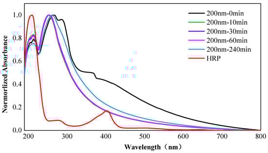 The UV-vis spectrum is an effective tool for observing changes in the structure of HRP. In the study, the UV-vis absorption spectra are plotted based on the smoothed and normalized data. According to Figure 7, the UV-vis absorption spectra of PS-HRP PC with an incubation time of 10 min, 30 min, and 60 min are coincident, meaning that the structure essentially remains unchanged over time. When NPs are incubated with HRP for 10 min, the absorption peak of the UV-vis absorption spectrum undergoes an increase in intensity at a wavelength of 213 nm and a blue shift at 263 nm due to the formation of the PC. Then at 240 min, the absorption peak underwent a decrease in intensity at 213 nm and was weaker than that of pristine NPs. Meanwhile, a redshifted shift at 263 nm occurred and was located on the shorter wavelength side of pristine NPs. The redshift means the formation of a dense PC on the surface of NPs, which was consistent with the adsorption of proteins on the surface of NPs. Overall, the formation of PC has an effect on the structure of itself and HRP. Though the more significant conformational change is observed in the hard PC around smaller size nanoparticles compared to larger ones as the self-association forces hold the nanoplastics/protein complex [32]. NPs are prone to interact with proteins, and this interaction fundamentally changes the functionally crucial secondary structure of these biomolecules and thereby denatures them [33], which may lead to the misfolding of proteins and alterations in enzymes.