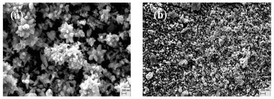 Zheng et al. [] investigated the plant-mediated synthesised and the chemically synthesised ZnO NPs. The different synthesis routes resulted in ZnO NPs of different morphologies, with the Plectranthus amboinicus-mediated ZnO NPs being rod-shaped with an average particle size of 88 nm whereas the chemically synthesised ZnO NPs were spherical with an average particle size of 74 nm. Comparative studies between the plant-mediated and the chemical synthesis were also reported by Upadhaya et al. []. The plant-mediated synthesis was performed using Ocimum tenuiflorum leaf extracts. The O. tenuiflorum extract was boiled at 60–70 °C and 5 mg of zinc nitrate was added at 70 °C. A deep reddish paste was obtained and dried at 100–130 °C for 45 min to obtain yellowish ZnO NPs. The chemical synthesis was performed by heating a mixture of thiol-urea, Zn(CH3COO)2·2H2O and NH4OH in a 1:1:1 ratio to 80 °C. The ZnO NPs were obtained after washing with acetone, ethanol, and deionised water. The chemically synthesised ZnO NPs had larger crystallite sizes compared to the O. tenuiflorum-mediated ZnO NPs. The differences in morphologies were also noted, with the chemically derived ZnO NPs exhibiting nanoflowers with some agglomeration and the O. tenuiflorum-mediated ZnO being spherical and agglomerated, as shown in Figure 1.