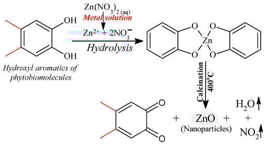 In general, phytochemicals from plants can be extracted using a variety of solvents such as water, acetone, methanol, ethanol, ether, and petroleum. When it comes to the solvent extraction of phytochemicals, “like dissolves like”, which means that polar solvents target polar molecules, while non-polar solvents target non-polar compounds. Alcohol-based extraction with ethanol yields phytochemicals such as saponins, tannins, phenones, polyphenols, terpenoids, etc. []. Solvent selection is an important aspect of plant-mediated synthesis of NPs, and this is because it affects the composition and concentration of the phytochemicals involved in the reduction and stabilisation of NPs during synthesis []. Water is the most common solvent used for the extraction of the phytochemicals from the Lamiaceae family of plants. This is not unexpected given that water is the most often used solvent for phytochemical extraction in plant-mediated NP synthesis. This is because water is non-toxic, non-flammable, and cost-effective. Moreover, because water is a polar solvent, it can yield biomolecules such as polyphenols, which are capable of reducing Zn salt precursors during synthesis.