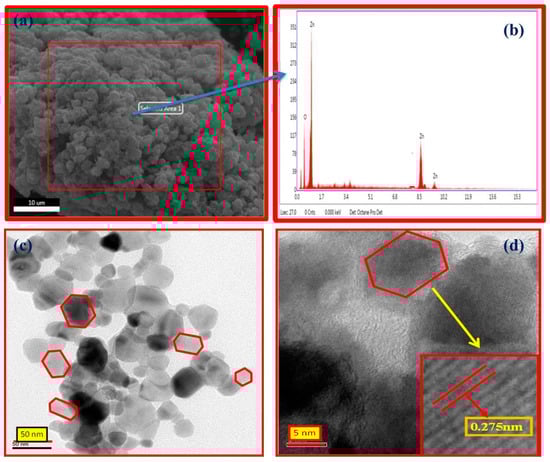 To the best of our knowledge, most of the studies using Lamiaceae plant extracts for the synthesis of the ZnO NPs did not report on the effect of Zn salt precursor concentration on the obtained ZnO NPs. However, Sharma et al. [] investigated the effect of the Zn salt precursor concentration on the ZnO NPs synthesised using O. tenuiflorum and Zn(CH3COO)2·2H2O as the Zn salt precursor. The authors observed that there were no significant differences in the crystalline structure for the varying Zn salt precursor concentrations of 5, 10, and 50 mmol kg−1. Nonetheless, there were significant differences in the morphology of the O. tenuiflorum-mediated ZnO NPs at different Zn salt precursor concentrations. According to the SEM results, O. tenuiflorum-mediated ZnO NPs synthesised with 5 mmol kg−1 Zn salt precursor were nanospheres and nanomushrooms of varying dimensions together with a few clusters of tiny nanoparticles. While the ZnO NPs synthesised using 10 and 50 mmol kg−1 Zn salt precursors were rough with spherical particles of ZnO NPs that agglomerated to a sponge-like morphology and nanocapsules that aggregated to form voids, respectively [].