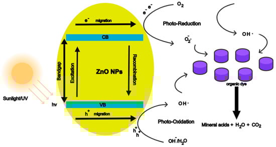 Organic dyes are a major pollutant found in wastewater from the textile, rubber, cosmetics, leather, pharmaceutical, and printing industries []. More than 10–15% of the global 7 × 105 tonnes of organic dyes produced annually end up as waste. These organic dyes make their way into the environment, where they cause adverse harm to humans, flora, and fauna []. The removal of these harmful substances from wastewater is very crucial in order to safeguard life and the environment. However, the conventional methods for removal of organic dyes, such as adsorption, ion flotation, sedimentation, coagulation, flocculation, etc., fail to fully degrade the organic dyes or result in the production of high volumes of sludge, and some of these methods are cost ineffective [,,]. As a result, the photodegradation of organic dyes using photocatalysts has been getting attention since it results in the complete degradation of the organic dyes and is cost-effective and environmentally friendly. Properties of ZnO, such as a wide direct bandgap (3.37 eV), high quantum efficiency, unique electrical, optoelectronic and luminescence properties, and environmental friendliness make ZnO an excellent candidate for photodegradation of organic dyes [,].