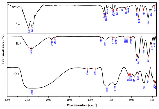 The FT-IR spectra of the CuO NPs, CdWO4 NPs, and CuO–CdWO4 NC samples are shown in Figure 1. The spectra show the presence of characteristic bands of functional groups (due to the plant extract) as well as metal-oxygen vibrations. The bands observed for the CuO NPs, CdWO4 NPs, and CuO–CdWO4 NC are listed in Table 1. Similar FT-IR spectra for CuO and CdWO4 samples were reported in the literature [22,27], which is explained in Appendix A. The characteristic IR absorption bands due to both CuO and CdWO4 phases are presented in the CuO–CdWO4 nanocomposite (Figure 1c). However, the position of the bands appears to be shifted because of the interaction between these two semiconductors compared to the individual spectra of CuO (Figure 1a) and CdWO4 (Figure 1b). The FT-IR spectrum of the CuO–CdWO4 nanocomposite reveals the bands around 3400 cm−1, pertaining to the stretching vibration of the O–H groups of adsorbed water or hydroxyl groups due to plant extract. The Cu–O bond has two bands at 604 cm−1and 714 cm−1 [34]. The other bands between 400–1000 cm−1 are the characteristics of the intrinsic vibrations from CdWO4 [35,36]. The stretching bands between 1700–1000 cm−1 are ascribed to various functional groups, such as -C=O, -NH, aromatic C=C, aromatic C−C, and -C−O groups, that came from the plant extract [22,27,32,37]. These results are in agreement with the previously reported literature [22,27,32,38].