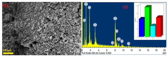The SEM images of the CuO, CdWO4, and CuO–CdWO4 nanocomposite samples indicate the presence of irregularly shaped aggregated particles of various sizes with rough texture (Figure 3). The presence of macro-size pore channels in between the particle aggregates can be observed in the SEM image of the nanocomposite. The EDX analytical results for the CuO–CdWO4 nanocomposite are presented in Figure 3d and Table 2. The changes in the elemental composition in the CuO–CdWO4 composite from the parent CuO and CdWO4 can be clearly observed from the EDX analysis of the previously reported bare CuO [22] and CdWO4 [27] (Table 2). These elemental composition of the CuO–CdWO4 composite was found to be 22.85% O, 38.24% Cu, 14.05% Cd, and 24.85% W. These results suggest that successful one-pot synthesis of a CuO–CdWO4 composite is possible via the green method.