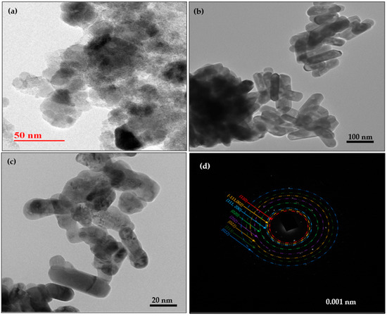 The TEM analysis was performed to a get better understanding of the morphology and particle size of the synthesized samples. It is clear from the TEM images that the CuO crystals are grown with irregular shapes with small-size particles (Figure 4a), while the CdWO4 sample exhibits the presence of relatively large-size, rod-shaped particles (Figure 4b). Interestingly, the TEM image of the CuO–CdWO4 composite shows the presence of nanocapsules along with irregularly shaped agglomerated NPs, as shown in Figure 4c. The existence of an interaction between CuO and CdWO4 is confirmed by the oriented attachment between the metal oxides (rod-shaped CdWO4 and irregular CuO) [40,41]. The SEAD pattern for the CuO–CdWO4 sample is shown in Figure 4d; the image shows several diffraction rings corresponding to the planes for the CuO and CdWO4 crystal structures [41,42].