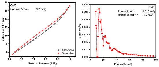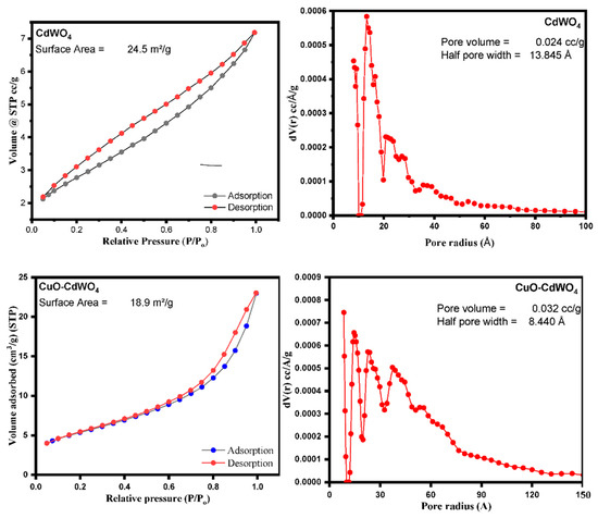 The textural properties for the synthesized CuO, CdWO4 and CuO–CdWO4 nanocomposite samples was investigated using N2 physisorption analysis (Figure 5). The N2 adsorption-desorption isotherms for the CuO, CdWO4, and CuO–CdWO4 samples adopt type-III isotherm with apparent H3 hysteresis loop as per IUPAC classification [43]. The occurrence of type-III adsorption-desorption isotherm reflects the interaction of the adsorbate on the surface of the adsorbent. The observed H3 hysteresis reflects N2 adsorption owing to the capillary condensation, and it is possibly due to the uneven distribution of aggregates in the sample with complex pore channels. The pore size distribution patterns for the synthesized samples were obtained using the NLDFT model. The results indicated the appearance of PSD peaks corresponding to macropores in the CuO–CdWO4 sample, probably due to the aggregation between CuO and CdWO4 particles forming large-size voids. The analysis reflected the specific surface area of the CuO–CdWO4, which was calculated to be 18.9 m2/g with a pore volume of 0.032 cc/g and a half pore width of 8.440 Å, respectively.