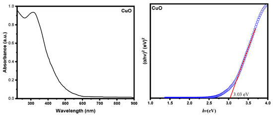 Figure 6 depicts the DR UV-vis absorption spectra for the CuO, CdWO4, and CuO–CdWO4 nanocomposite samples and shows a broad absorption peak centered around 350 nm. The optical absorption edge stretches from UV to visible region (from 300 nm to 500 nm), which may be attributed to the increase in the grain size of the samples. The UV-vis absorption data were used to measure the bandgap of the synthesized samples using the Tauc relation: , where ‘C’ is a constant, ‘ε’ is a molar extinction coefficient, ‘Eg’ is the bandgap of the sample, and ‘n’ stands for evaluating the type of transition [44]. In the Tauc plot, the intercept of the linear portion of the (εhν)2 vs. hν is on the x-axis, as shown in Figure 6. The bandgap values for the CuO, CdWO4, and CuO–CdWO4 were found to be around 3.03 eV, 3.05 eV, and 2.56 eV, respectively. Thus, the synthesized samples are expected to absorb visible light.