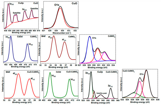 The synthesized samples were analyzed using XPS analysis to determine the surface properties of the samples. Comparative XPS analysis of the CuO, CdWO4, and CuO–CdWO4 samples was carried out and the changes in binding energy upon the interaction between CuO and CdWO4 were investigated (Figure 8). The XPS profiles confirm the coexistence of Cu, Cd, W, and O elements in the nanocomposite. The pristine CuO XPS spectra reveal the appearance of two characteristic peaks for Cu species with the spin energy separation of ~20 eV at 933.05 and 953.16 eV corresponding to the Cu2p3/2 and Cu 2p1/2, respectively [47]. Two satellite peaks also appear which could be assigned to the Cu2+ for the CuO sample. These peaks were identified following previous studies, where these peaks reveal the existence of Cu2+ oxidation in the CuO NPs [47,48]. The fitting of the O1s XPS spectra (for CuO) reveals two identical peaks at ~529.0 eV, suggesting the different environment of oxygen in the CuO sample [47]. The pristine CdWO4 XPS spectra for Cd ions appear with two characteristic peaks corresponding to the Cd3d5/2 and Cd3d3/2, with the spin energy separation of ~6.70 eV, at 405.58 eV and 412.32 eV, respectively, suggesting the existence of Cd2+ state in the CdWO4 sample [16]. The W 4f XPS spectrum indicates two characteristic peaks of the W element (+6 oxidation state in CdWO4) located at 35.37 eV and 37.62 eV, respectively [49]. The fitting of the O1s XPS spectra (for CdWO4) indicates the presence of three binding energy peaks at ~529.0, ~531.0, and ~532.5 eV, revealing the binding energy for adsorbed oxygen, hydroxyl oxygen, and lattice oxygen in the CdWO4 sample, respectively [16,49]. After the coupling of CuO to CdWO4, the shifting in the binding energy is clearly seen in the corresponding XPS spectra of the CuO–CdWO4 sample. The shift in binding energy is due to the electron transfer between CuO and CdWO4, which is very favorable for the improved photocatalyst application of CuO–CdWO4. The fitting of the O1s XPS spectrum for the CuO-CdWO4 sample results in the appearance of binding energies for O species from CuO, CdWO4, and adsorbed H2O [48,49]. Therefore, the XPS results confirm the formation of CuO–CdWO4 via a strong interaction between CuO and CdWO4, and these findings are consistent with other analytical results.