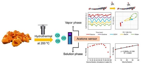 Acetone is a widely used solvent, but it is harmful, toxic and dangerous with low vapor pressure. When exposed to high levels of acetone, human bodies will suffer a lot of illnesses, including dermatitis, irritation, headaches, fatigue, nausea, etc. [46]. Peerasak Paoprasert et al. fabricated carbon dots (CDs) derived from jackfruit for acetone sensing in aqueous solution by the hydrothermal method [47]. The fluorescence intensity of CDs gradually increased with the increase of acetone concentration (0–70% v/v), but decreased when acetone concentration exceeded 70% v/v due to the limited solubility of CDs in acetone. In the meantime, the CDs successfully determined acetone in water in the concentration range of 0–40% v/v with an LOD of 1.5% v/v. The synthesis and application of CDs from jackfruit is shown in Figure 6. DFT calculations confirmed that these interfacial interactions and electronic coupling caused changes in electronic states and then altered the optical properties of CDs. At the same time, the CDs films could be integrated into the optical electronic nose to detect acetone vapor in a real-time manner at room temperature. The CDs had strong electron donating and accepting properties, demonstrating their potential applications in ambipolar electronic devices. However, the quantum yield of CDs in solution was only 5.2%, which greatly limited their practical detection applications in the future.