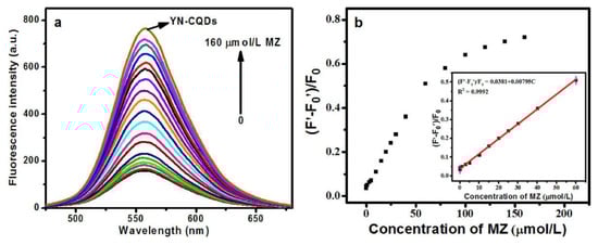 Schematic illustration of (a) fluorescence emission spectra of the YN-CQDs/Ag+ system upon addition of various concentrations of MZ. (b) relationship between recovery efficiency and the concentration of MZ. Inset: a linear relationship of recovery efficiency versus the concentration of MZ over the range from 0.003 to 60 μM. Adapted with permission from Yu et al., 2021, Copyright 2021. Reproduced with permission from Elsevier [70].