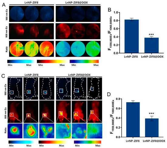 (A) NIR-II FL imaging of MCF-7 cells after incubation with LnNP@ZIF8 and LnNP@ZIF8-DOX, respectively. Min: ratio = 0; Max: ratio = 1. (B) The corresponding ratiometric F1550,980Ex/F1060,808Ex value of (A). (C) NIR-II imaging of 4T1 orthotopic tumor mice treated with LnNP@ZIF8 and LnNP@ZIF8-DOX under 808 and 980 nm laser irradiation and high magnification NIR-II ratio diagrams of tumor sites treated with nanoprobe. (D) The corresponding ratiometric F1550,980Ex/F1060,808Ex value of the tumor site ratio diagrams. All experiments were performed independently at least three times. *** p < 0.001 were determined by one-way ANOVA with Student’s t tests (two-tailed).